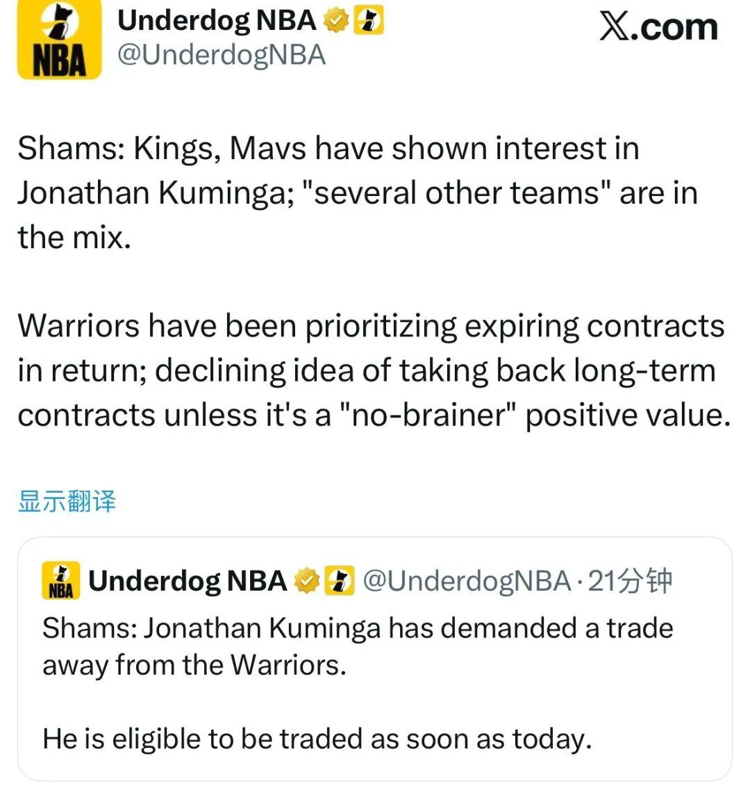 真着急,超级急不可耐,装不了一点的那种。前脚解除交易限制,后脚就立刻马上申请交易。再见了,库明加。值得一提的是,库明加已连续13场没有在勇士比赛中披挂上阵......有着勇士怕他受伤影响交易价值的原因,也有本人不想打的缘故,总之毫不客气地说双方的合作关系早就已经结束。同样来自Shams的消息源,去年休赛期签约的两年4680万美元续约合同(第二年球队选项),库...